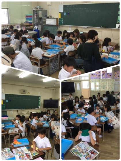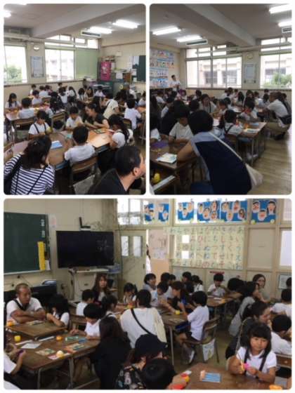 5年生は学年で外国語の学習です。タブレットの扱いも手馴れています。1年生は、お家の人と一緒に頑張っています。