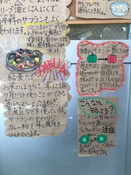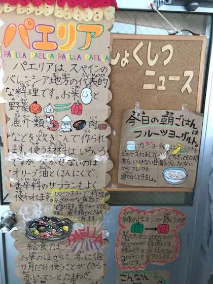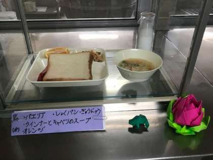 パエリア、ウインナーとキャベツのスープ、オレンジ、食パン、牛乳