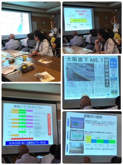 本日は、防災学習会で、大阪市危機管理室より船井様、西淀川区役所より横内様を講師に迎え、阪神大震災や東日本大震災を例に、来るべき巨大災害に備えて、自助、共助の大切さについて学びました。