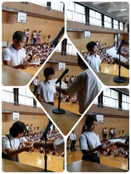 まず1時間目に講堂において、終業式を行いました。校長先生からは、1学期のがんばりや今後の目標についてお話がありました。また、全労災 子ども絵画コンクール受賞者の表彰も行いました。