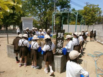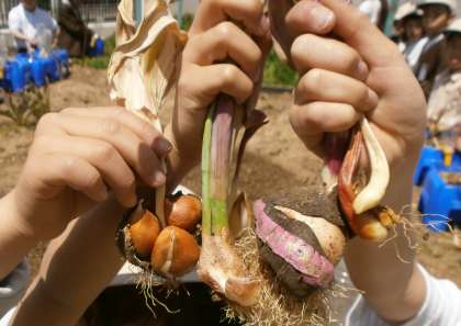2年生が昨年植えていたチューリップの花をつけた後に、葉を残しておいていました。今日、球根を掘り起こしてみると、球根ができていました。来年も、花をつけるといいですね。