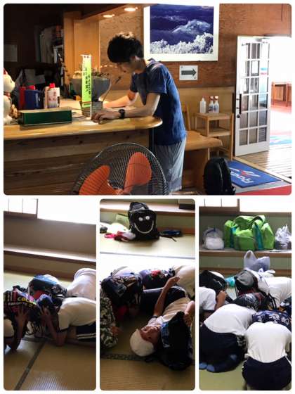 宿舎の部屋の中に入り、魚つかみ、入浴の準備を済ませた後、地震を想定した避難訓練をしました。
