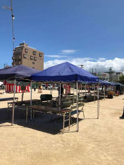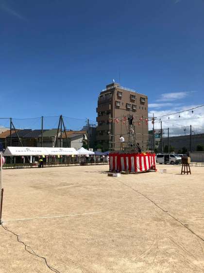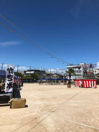 今日は大和田小学校の運動場で夕方5時から9時まで夏祭りがあります。地域の皆さんが本番に向けて準備をしてくださっています。