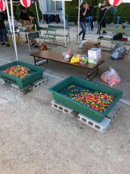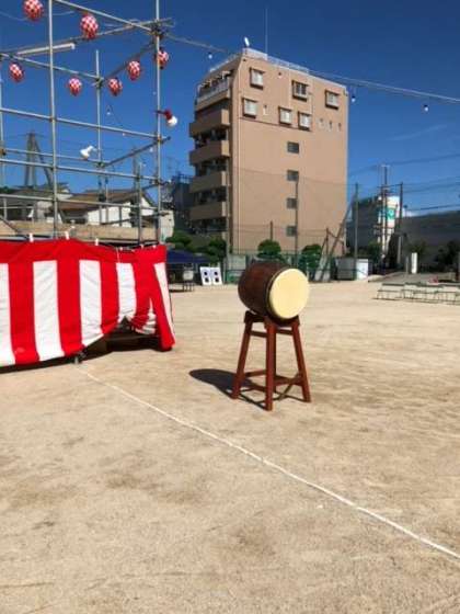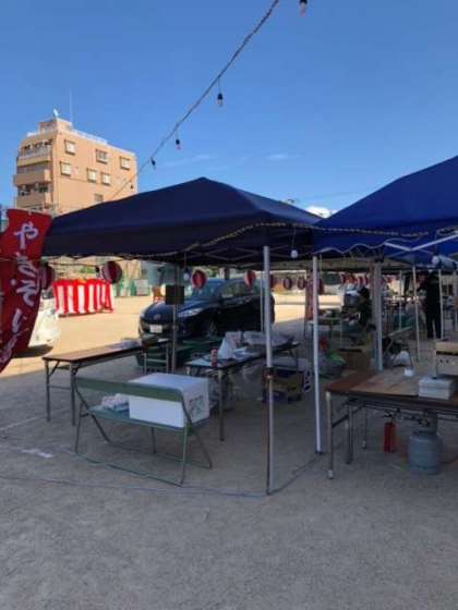 夕方に向けて、着々と準備が進んでいます。提灯や太鼓もセットされ、たくさんの物資が搬入されて来ています。