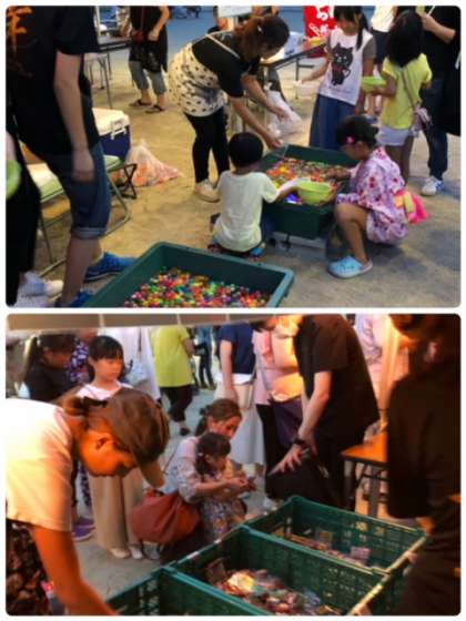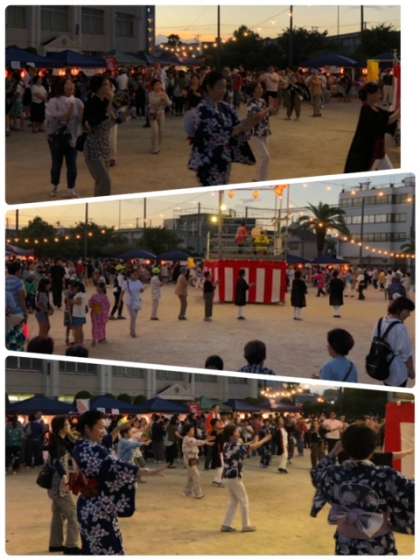 日も沈み、提灯が綺麗に映えています。盆踊りもスタートし、益々夏祭りらしくなって来ました。まだ、お越しでない方は、ぜひお越しください。終了は9時となっております。