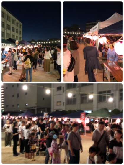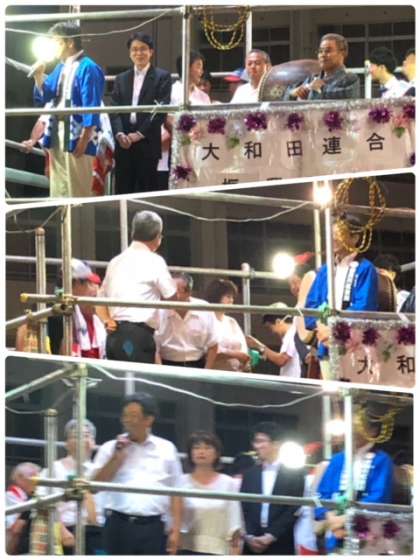 夏祭りも中盤を迎え、セレモニーが行われています。来賓の方がご挨拶されています。祭りは益々賑わいを見せています。終了は9時となっております。ぜひお越しください。