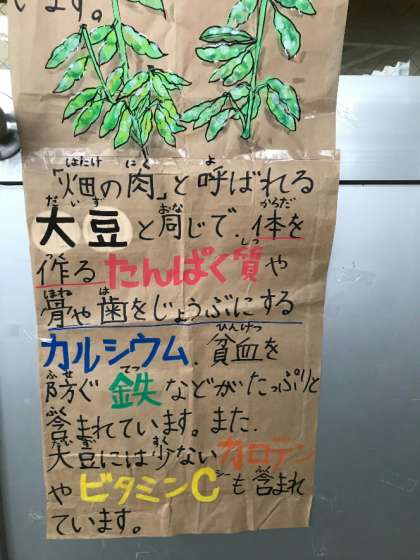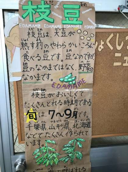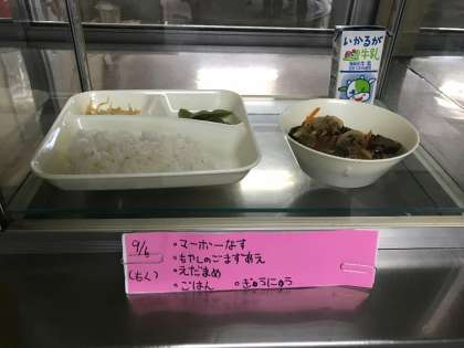 今日の給食の献立は、マーボーなす、もやしのごま酢あえ、枝豆、ごはん、ぎゅうにゅうでした。
