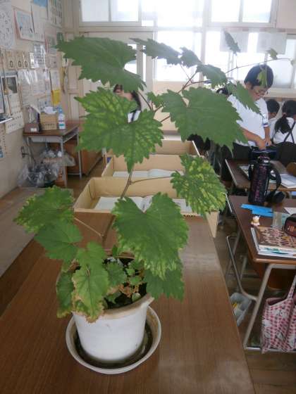 先日お知らせしました、給食に出てきた巨峰ですが、どんどん育って大きくなっています。育ちすぎて、そろそろ地面に植え替えてやる頃になってきました。学校で、大きくなったブドウがみんなの楽しみになれる場所を物色中です。子どもたちではないですが、だんだん楽しみが膨らんできています。