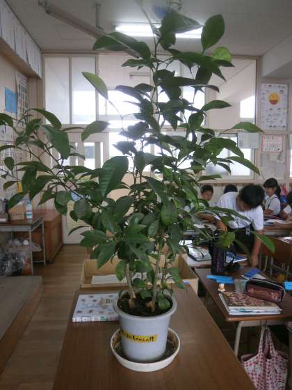 もう一つは、今の中学生たちが蒔いた、給食の夏みかんです。これも大きくなって植木鉢では窮屈になっています。4年1組の教室が果樹園になる日も近いかも・・・?