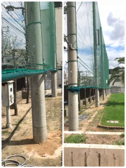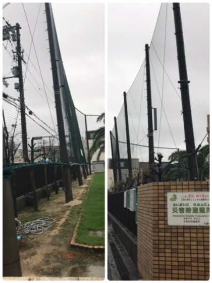 非常に強い台風21号の影響により、防球ネットの支柱が道路側に傾いていました。地域の皆様にはずいぶんご心配をおかけしました。