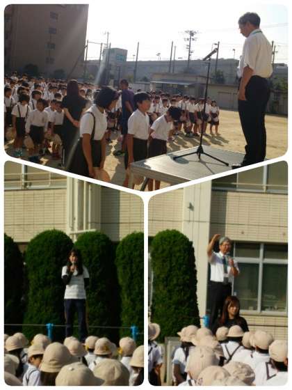 まず校長先生からは、昨日の敬老の日や1年間の祝祭日について、先日土曜日に行われた西淀川区の区民祭りについて、そして今週水木曜日の6年生の修学旅行について、3つお話がありました。