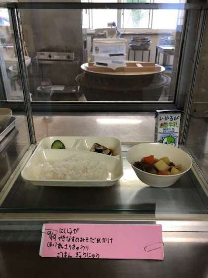 今日の献立は、肉じゃが、焼きなすのみそだれかけ、あっさりきゅうり、ごはん、牛乳です。