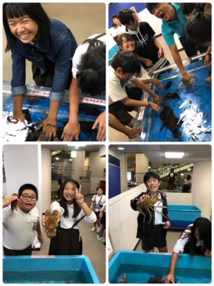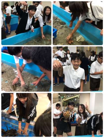 中には直接触ることができるタッチプールがありました。ドクターフィッシュのプールに大はしゃぎ。その他、伊勢エビ、なまこ、ヒトデ、サメやエイなど、いろんな生き物に触れて興奮気味です。