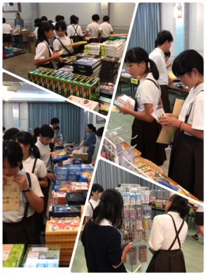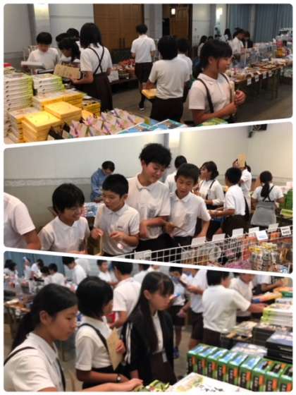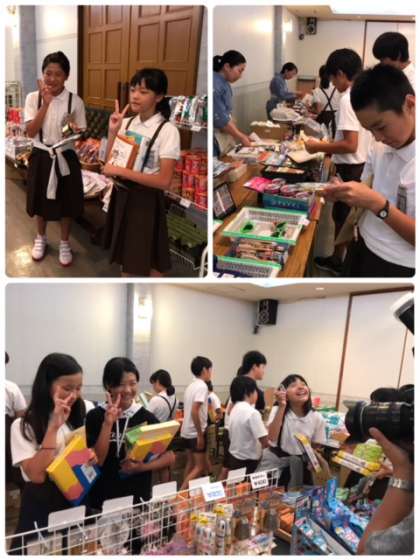 ホテル内のお土産売り場で、楽しくお土産選びをしています。家族や大切な人、自分へのお土産を買っていました。