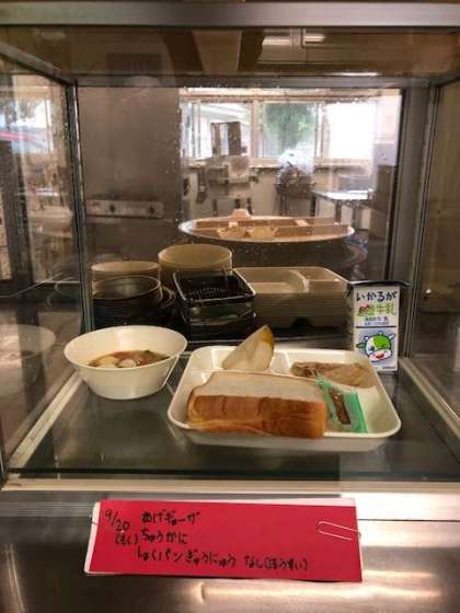 揚げギョーザ、中華煮、豊水なし、食パン、牛乳です。