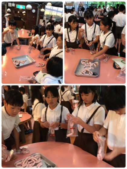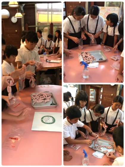 出来上がったソーセージを、仲良く公平に分けています。保存料を使用していないので、お早めにお召し上がりください。これもステキなお土産になります。