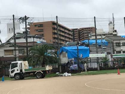 先日の台風の影響で、道路側に傾いた防球ネットの支柱ですが、取り急ぎ先日もとのようにまっすぐにおこしました。