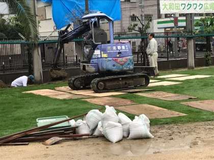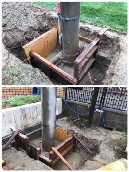 それだけでは心配なので、根掘りと言って、支柱の根元の周りを掘り、そこをコンクリートで固める工事を始めています。この工事が済めばひと安心です。早く乾いて固まるようにいい天気を期待します。