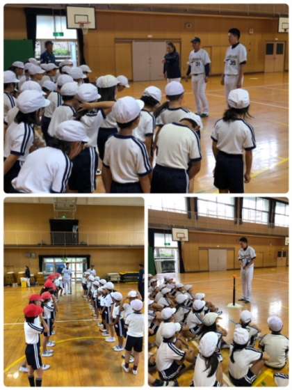 今日はオリックスBsの方にお越しいただき、ティーボールを教えていただきました。最初は、丁寧な攻守の説明をしていただき、その後試合をしました。どの児童も、楽しく取り組めていました。