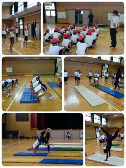 マット運動の一番基礎となる前転から始まり、補助倒立や側方倒立回転など、さまざまな技について実演を交えて教えていただきました。
