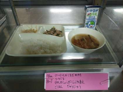 今日の献立は、鶏肉のごまだれやき、ソーキ汁、もやしの生姜じょうゆあえ、ごはん、牛乳です。