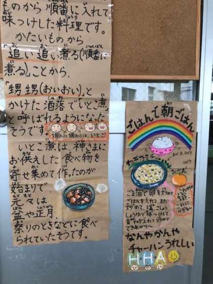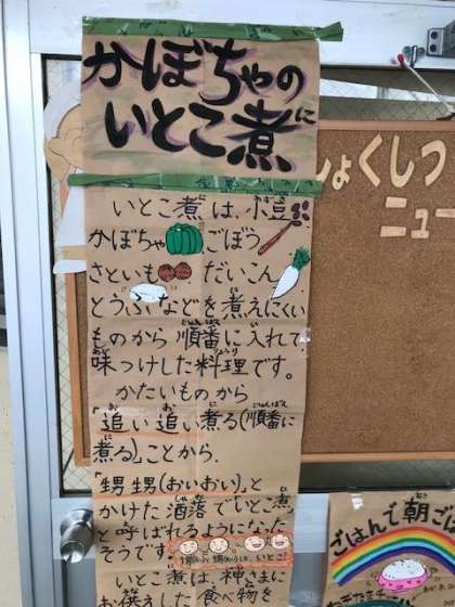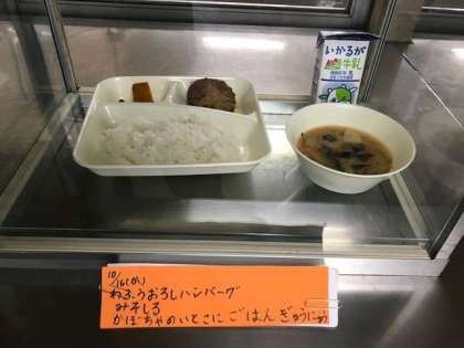 和風おろしハンバーグ、味噌汁、カボチャのいとこ煮、ご飯、牛乳