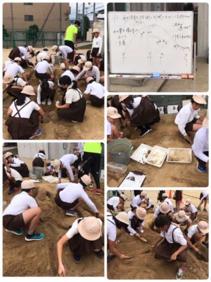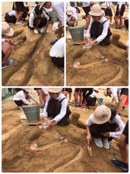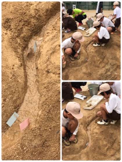 流れる水のはたらきの学習として、実験をしています。コースを作り、小旗を立て、水を流してどうなるか、観察しています。