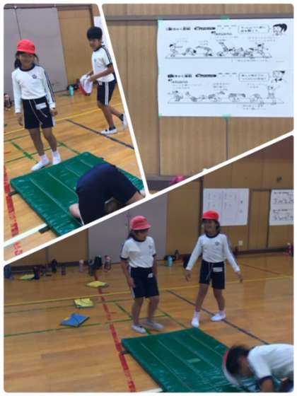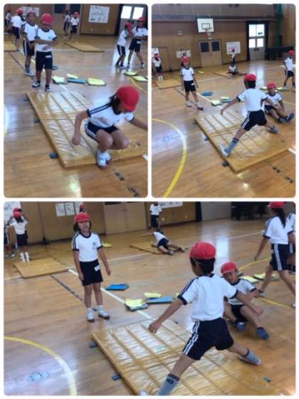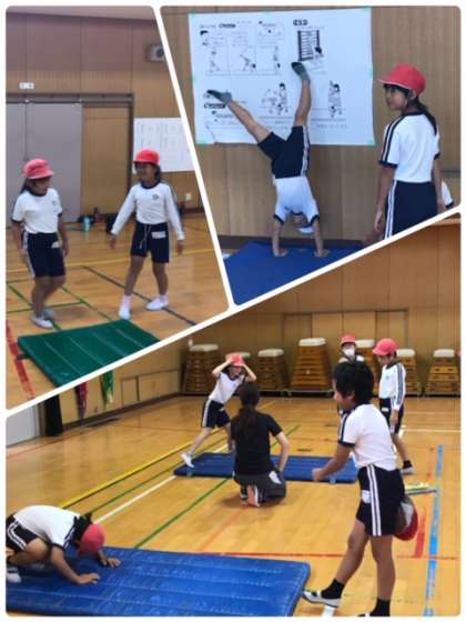 講堂で、倒立や開脚前転、開脚後転など、いろいろな技に挑戦しています。