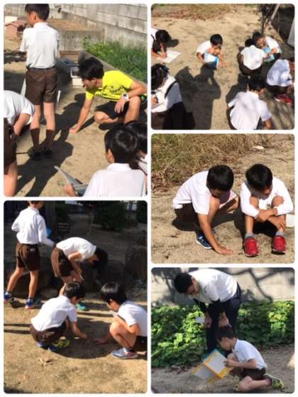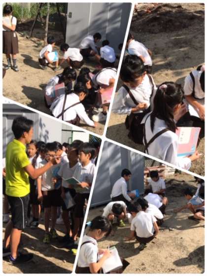 理科で、ひなたと日かげの違いについて学習しています。学習園に行き、実際に地面を触ってあたたかさを比べてみたりしました。その様子をすぐにノートに記録しています。