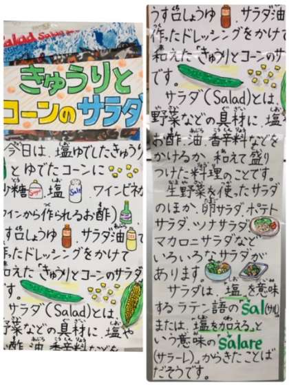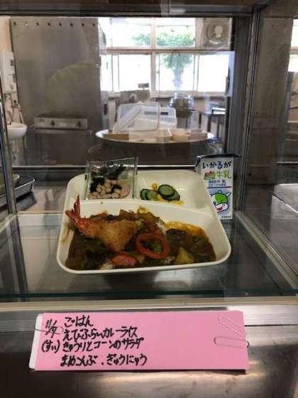 今日の献立は、えびフライカレーライス、きゅうりとコーンのサラダ、豆こんぶ、牛乳です。