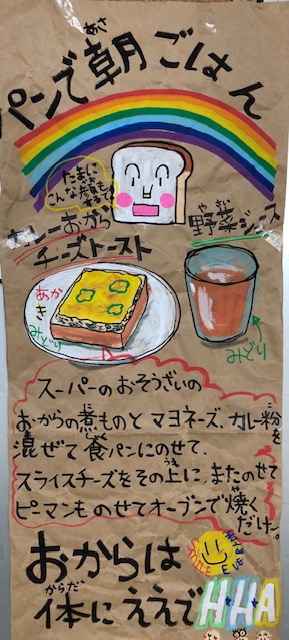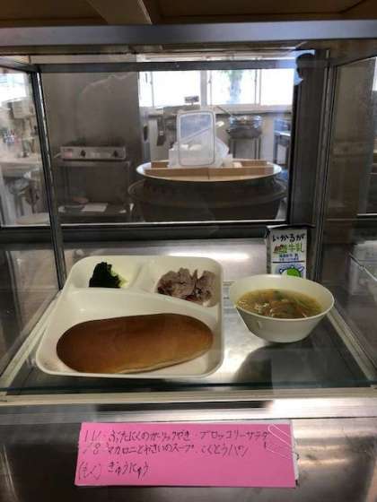 今日の献立は、豚肉のガーリック焼き、マカロニと野菜のスープ、ブロッコリーのサラダ、こくとうパン、牛乳です。