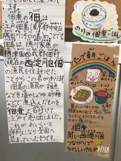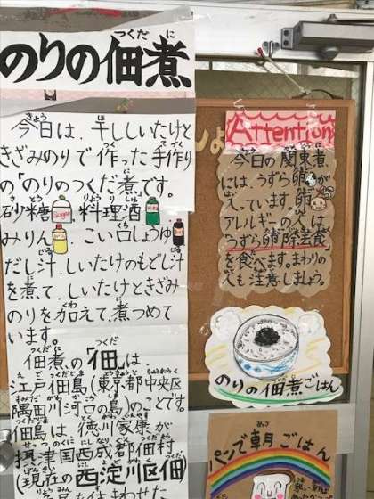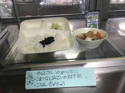 関東煮、海苔の佃煮、小松菜と白菜の甘酢和え、ご飯、牛乳