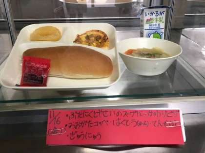 豚肉と野菜のスープ煮、変わりピザ、白桃、大型コッペ、牛乳