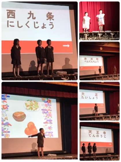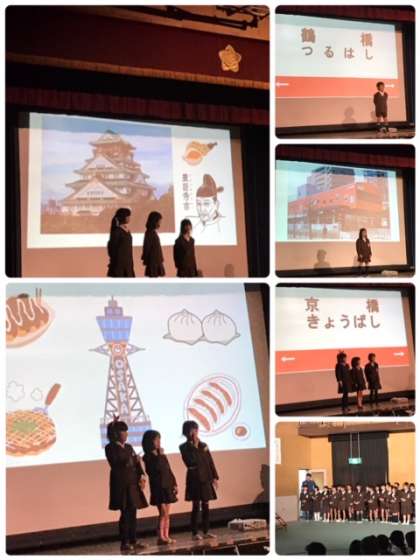 環状線一周、ハルカスへの社会見学で学んだことを、分担して上手に発表したいました。各駅の着メロも使い、大阪の良さを発表できました。もちろん笑いの町ですので、その要素も取り入れていました。