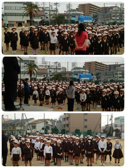 今日の児童朝会では、まず校長先生から、大阪万博決定のお話と今週来週の「あいさつ週間」「HHA 強調週間」「なわとび週間」についてのお話をしていただきました。