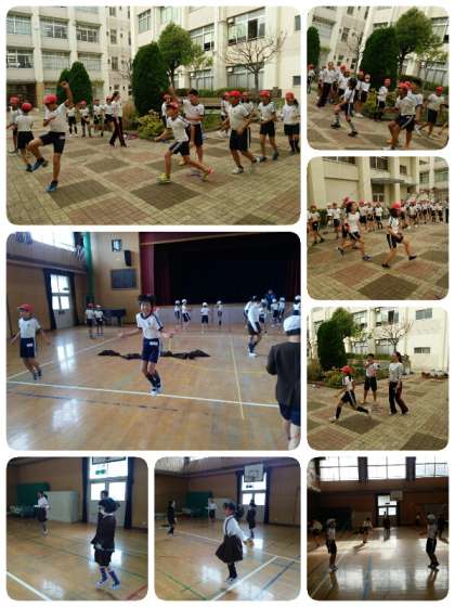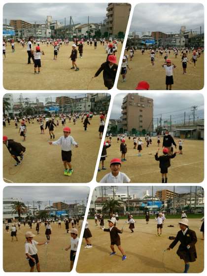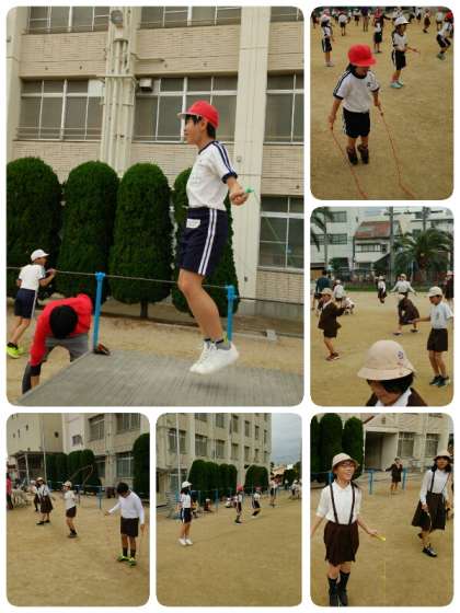 心配された雨も今のところ大丈夫です。低学年の児童は運動場で元気になわとびをしました。