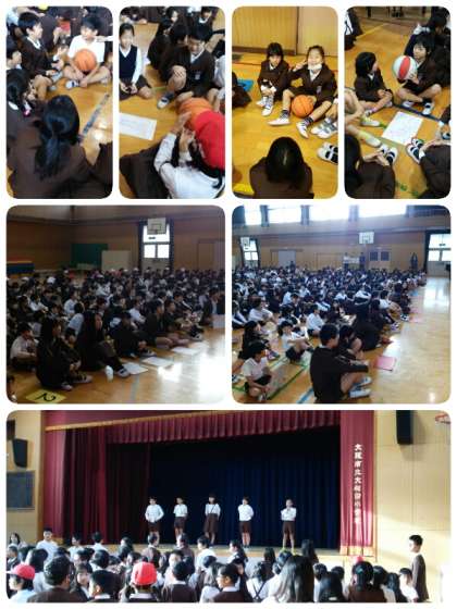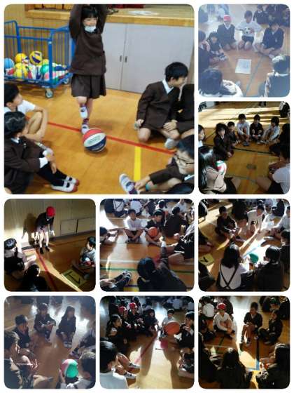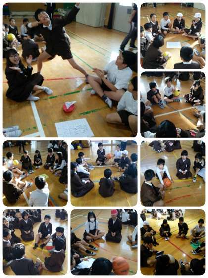 集会委員の司会さんが、ごろごろと言っている間はボールを回し、ドンと言ったときにボールを持っている児童が何かポーズをします。