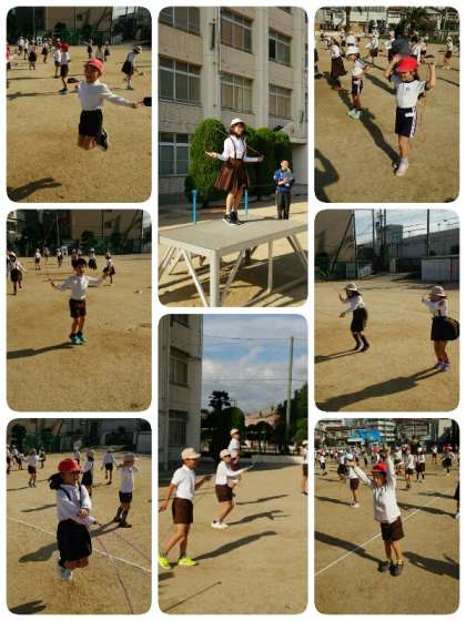 今日のチャレンジ跳びは、あやとびです。昨日のグーパー跳びよりも難しいようでしたが、みんな、あやとびに繰り返しチャレンジしました。