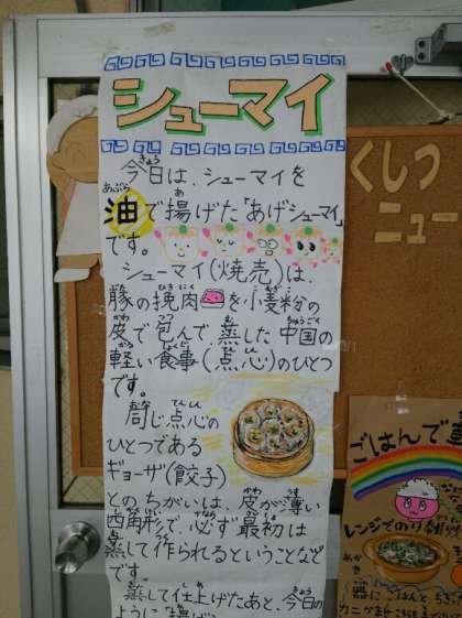 今日の献立は、あげシューマイ、えびと豆腐のスープ、もやしとコーンのピリ辛あえ、ごはん、牛乳です。