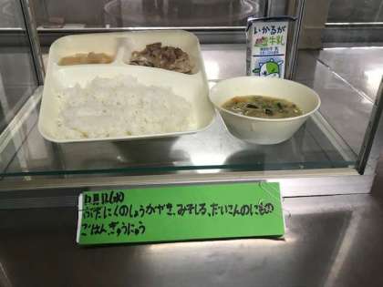 豚肉の生姜焼き、味噌汁、大根の煮物、ご飯、牛乳
