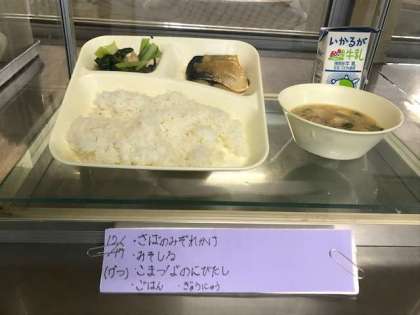サバのみぞれかけ、味噌汁、小松菜の煮びたし、ご飯、牛乳