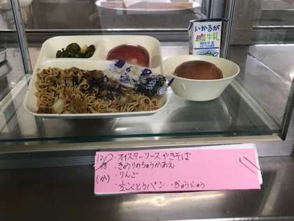 オイスターソース焼そば、キュウリの中華和え、黒糖パン、牛乳、りんご