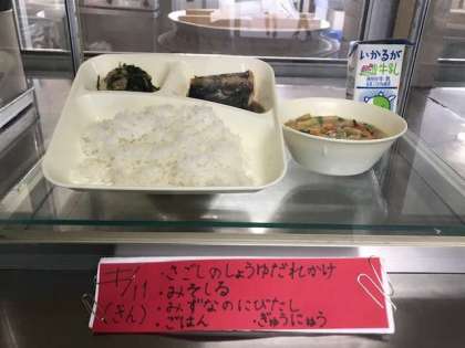 サゴシの醤油だれかけ、水菜の煮びたし、味噌汁、ご飯、牛乳