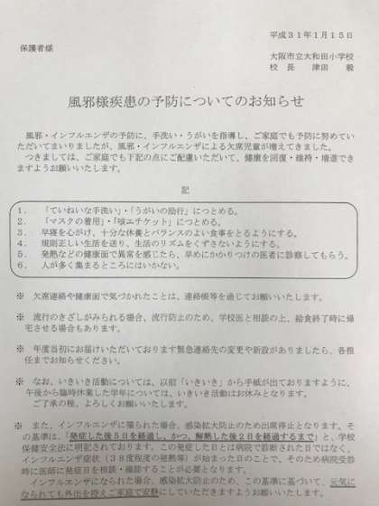 ところが、本日2年2組では、17名の欠席、そのうち13名がインフルエンザでした。そこで、本日給食後下校させ、明日から日曜日までの5日間学級休業とします。