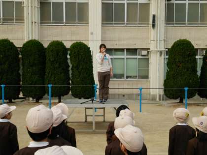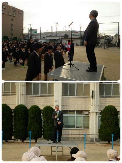 まず校長先生から、本日15日までがお正月の松飾をする松の内ということ、昨日は成人の日で大和田小学校にもたくさんの卒業生が成人式を終えて来校されたこと、また今週17日で阪神淡路大震災から24年が経過することについてお話していただきました。