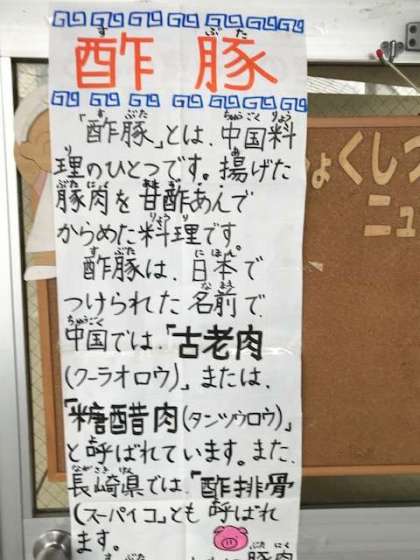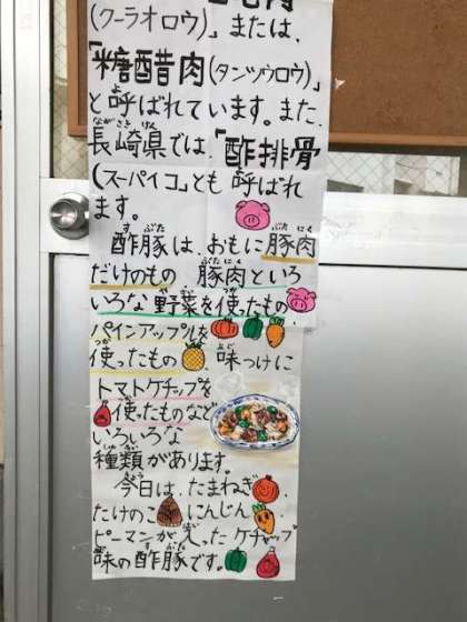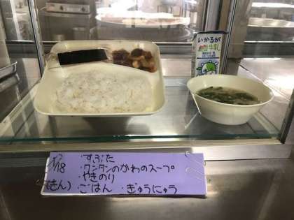 酢豚、ワンタンの皮のスープ、焼きのり、ご飯、牛乳