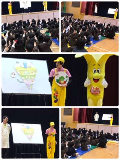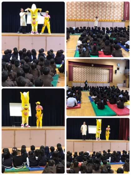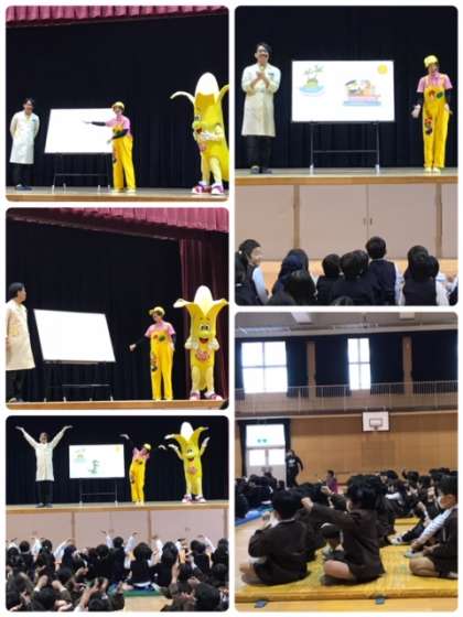 18日5時間目、大和田幼稚園と、本校1年生、2年生が一緒に、バナナのボビー君による食育の出前授業を受けました。