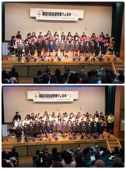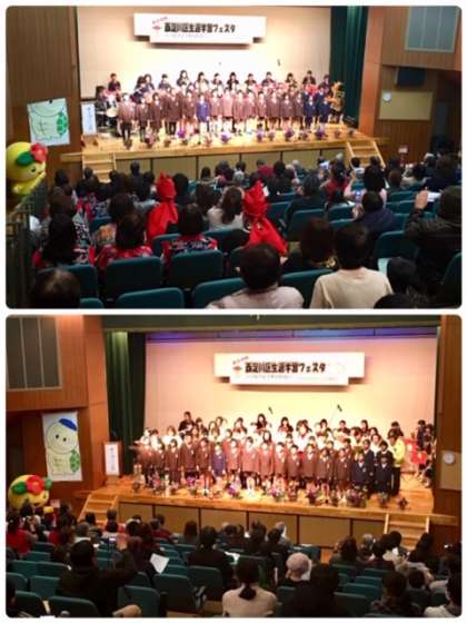 20日、エルモ西淀川で、西淀川区生涯学習フェスタが行われました。そのオープニングに、淀中学校音楽部と、本校児童、川北小、出来島小の児童が、出演しました。