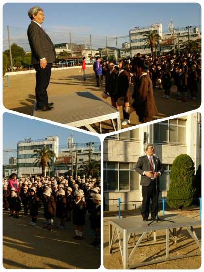 まず校長先生から、昨日、エルモ西淀川で行われた生涯学習フェスタについてお話がありました。参加した高学年児童の頑張りが素晴らしかったですと全校児童に伝えられました。