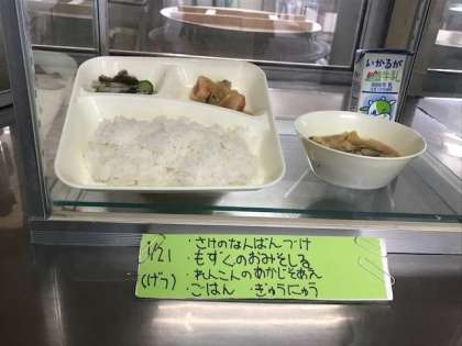 鮭の南蛮漬け、もずくのお味噌汁、レンコンの赤じそあえ、ご飯、牛乳
